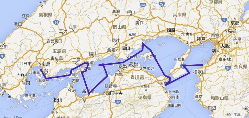 下図の広島観音マリーナから大阪府淡輪ヨットハーバーまでを、2014年9月20日(土)~10月19日(日)の1ヶ月をかけてクルージングを行います。